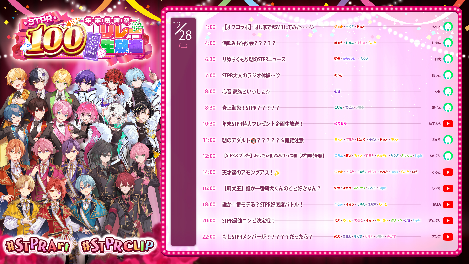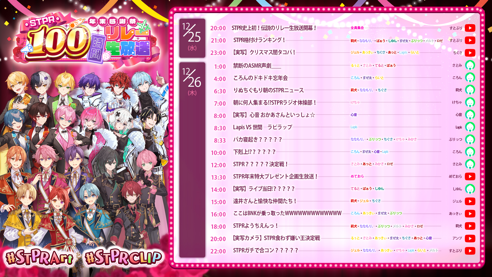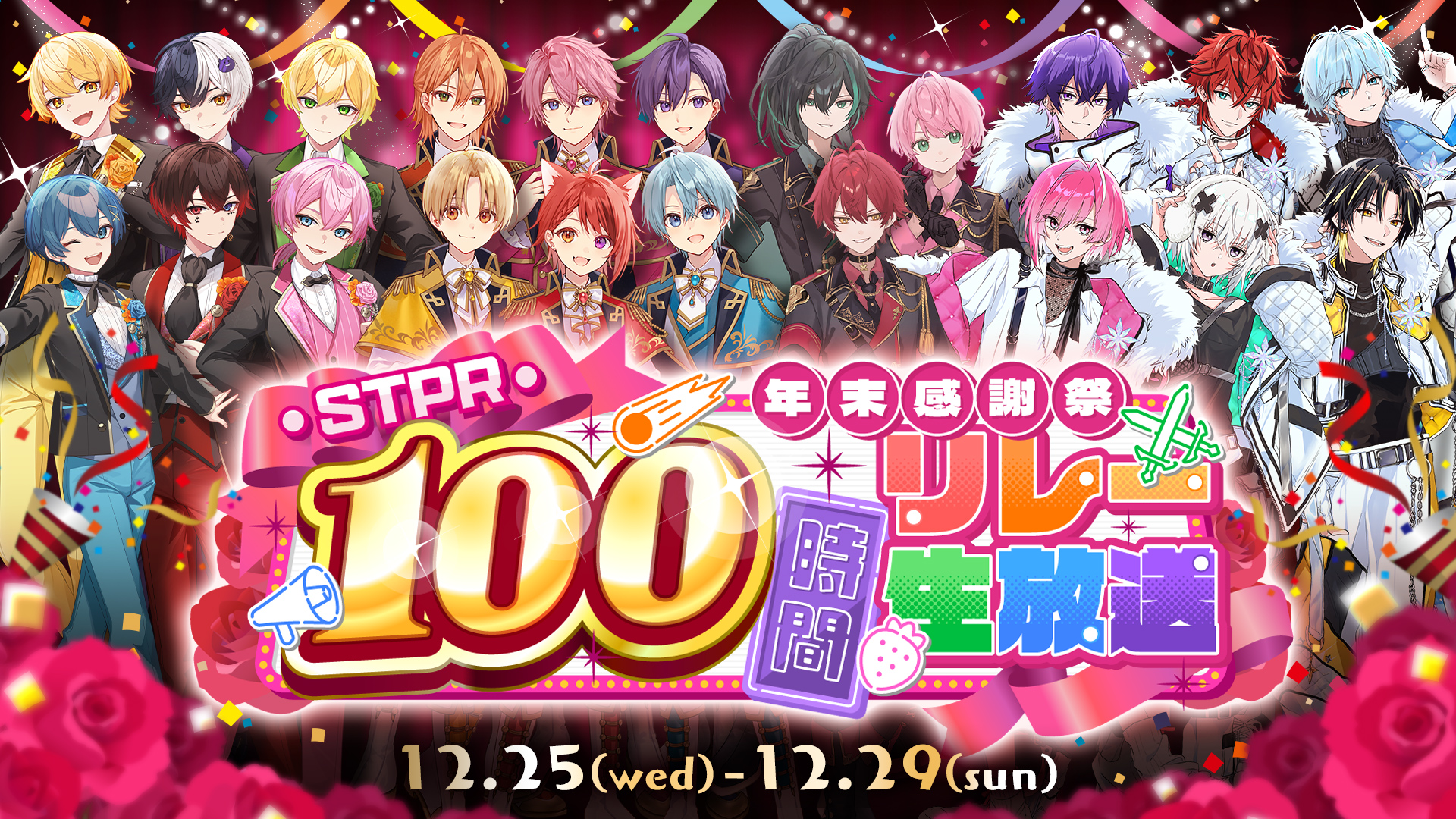 ”STPR初”となる4グループ合同の100時間リレー生放送は、「すとぷり 公式YouTubeチャンネル」にて2024年12月25日(水)20:00から放送する”STPR史上初!伝説のリレー生放送開幕!”からスタートし、12月29日(日)までさまざまな企画で生放送をつないでいきます。