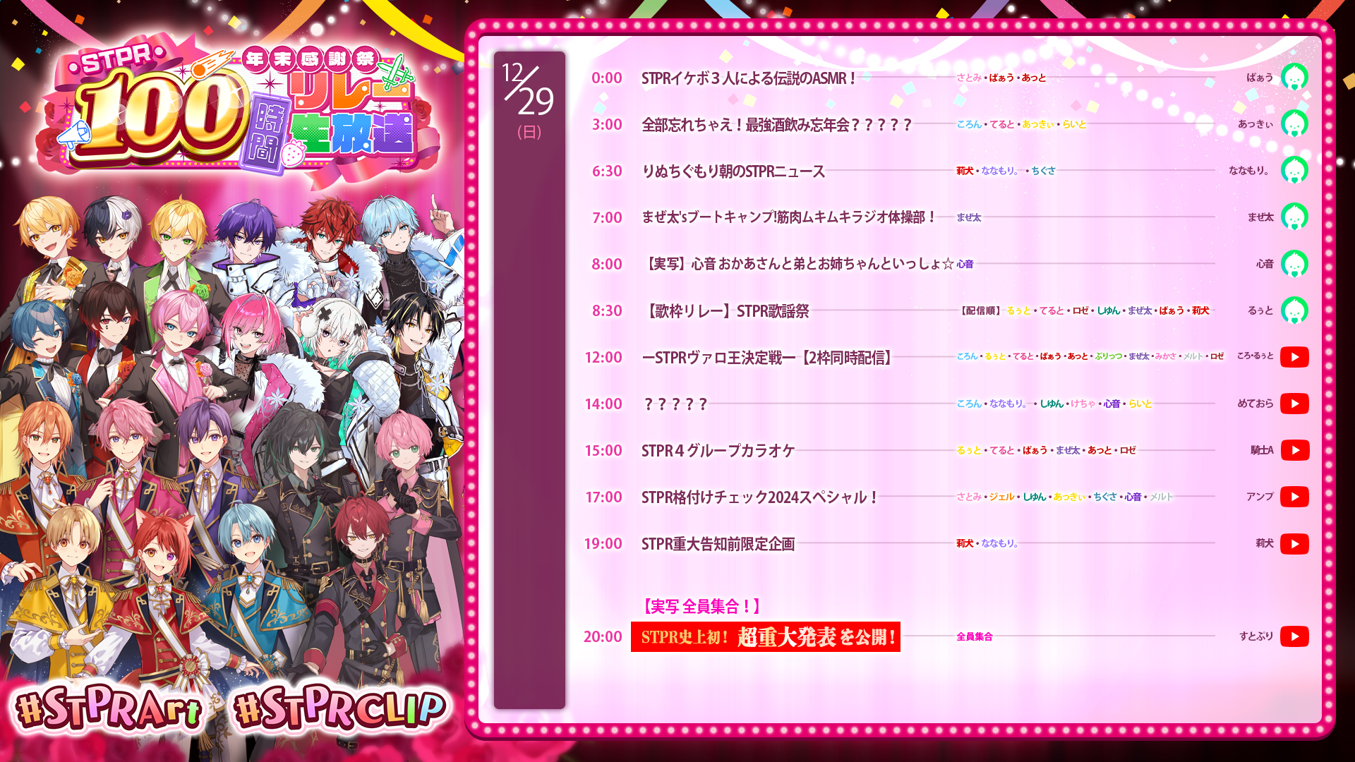 さらに、最終日の12月29日(日)20:00からは、4グループのメンバー全員が実写で「すとぷり 公式YouTubeチャンネル」に登場し、“STPR史上初”となる超重大発表を公開いたします!