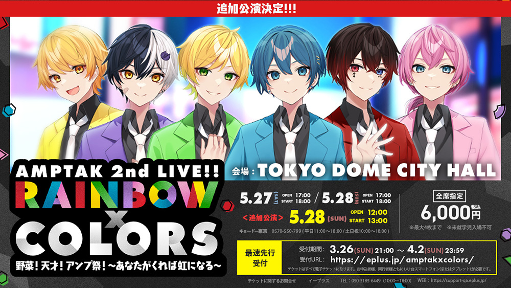 LIVE!!『RAINBOWxCOLORS』野菜!天才!アンプ祭!〜あなたがくれば虹になる〜」について、本日3月26日(日)23:59まで受付中となっている「最速チケット先行受付」に大変多くのお申し込みをいただいていることから、急遽、追加公演が決定いたしました!